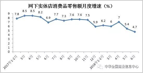 1-6月份,实体店零售额同比增长5.9%,比2017年同期回落2.1个百分点。其中,6月份同比增长4.7%,增速较上年同期放缓2.2个百分点。