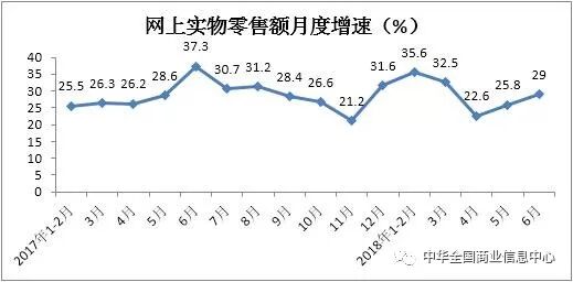 1-6月份网上实物商品零售额实现31277亿元,同比增长29.8%,增速比2017年同期加快1.2个百分点,对社会消费品零售总额增长的贡献率为46.4%,比2017年同期提高13.9个百分点,拉动社会消费品零售总额增长4.4个百分点,比2017年同期提高1.0个百分点。占社会消费品零售总额的比重为17.4%,比2017年同期提高3.6个百分点。4、5、6月份网上实物商品零售额分别同比增长22.6%、25.8%和29%,增速较2017年同期分别回落3.6、2.8和8.3个百分点。