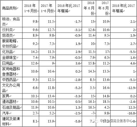 上半年限额以上单位商品中,建筑及装潢材料、文化办公用品、家具类、饮料类分别增长8.1%、6.6%、10.1%和9.6%,增速分别比2017年同期回落5.8、5.2、3.3和3.1个百分点。