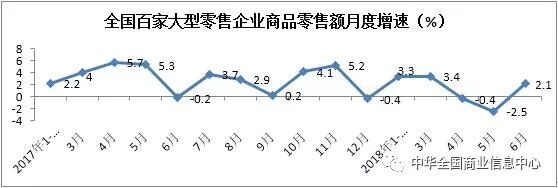 根据中华全国商业信息中心统计,上半年全国百家重点大型零售企业零售额同比增长1.7%,增速较去年同期放缓1.4个百分点。其中,4、5月份均为负增长,6月全国百家重点大型零售企业零售额同比增长2.1%,增速高于上年同期2.3个百分点。