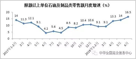上半年,限额以上单位石油及制品类零售额同比增长11.9%,增速比2017年同期加快1.3个百分点,拉动社会消费品零售总额增长0.61个百分点,比2017年同期提高0.02个百分点。其中,6月份石油及制品零售额同比增长16.5%,增速较2017年同期加快12.3个百分点。
