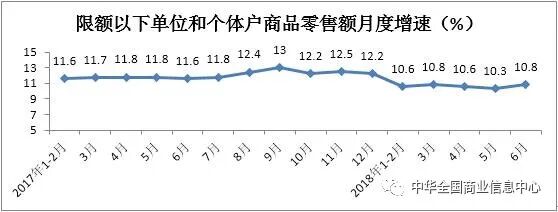 上半年,限额以下单位和个体户商品零售额实现95023亿元,同比增长10.5%,增速比2017年同期回落1.2个百分点。其中,6月份同比增长10.8%,增速较2017年同期放缓0.8个百分点。