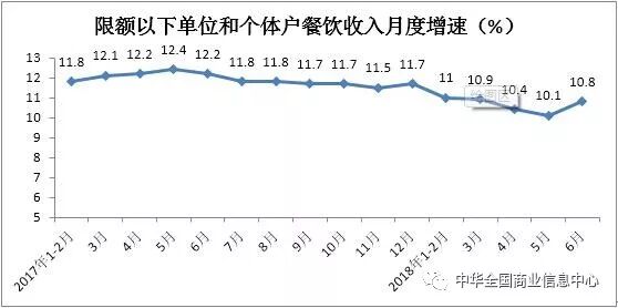 上半年,限额以下单位和个体户餐饮收入实现15058亿元,同比增长10.7%,增速比2017年同期回落1.4个百分点。其中,6月份同比增长10.8%,增速较2017年同期放缓1.4个百分点。