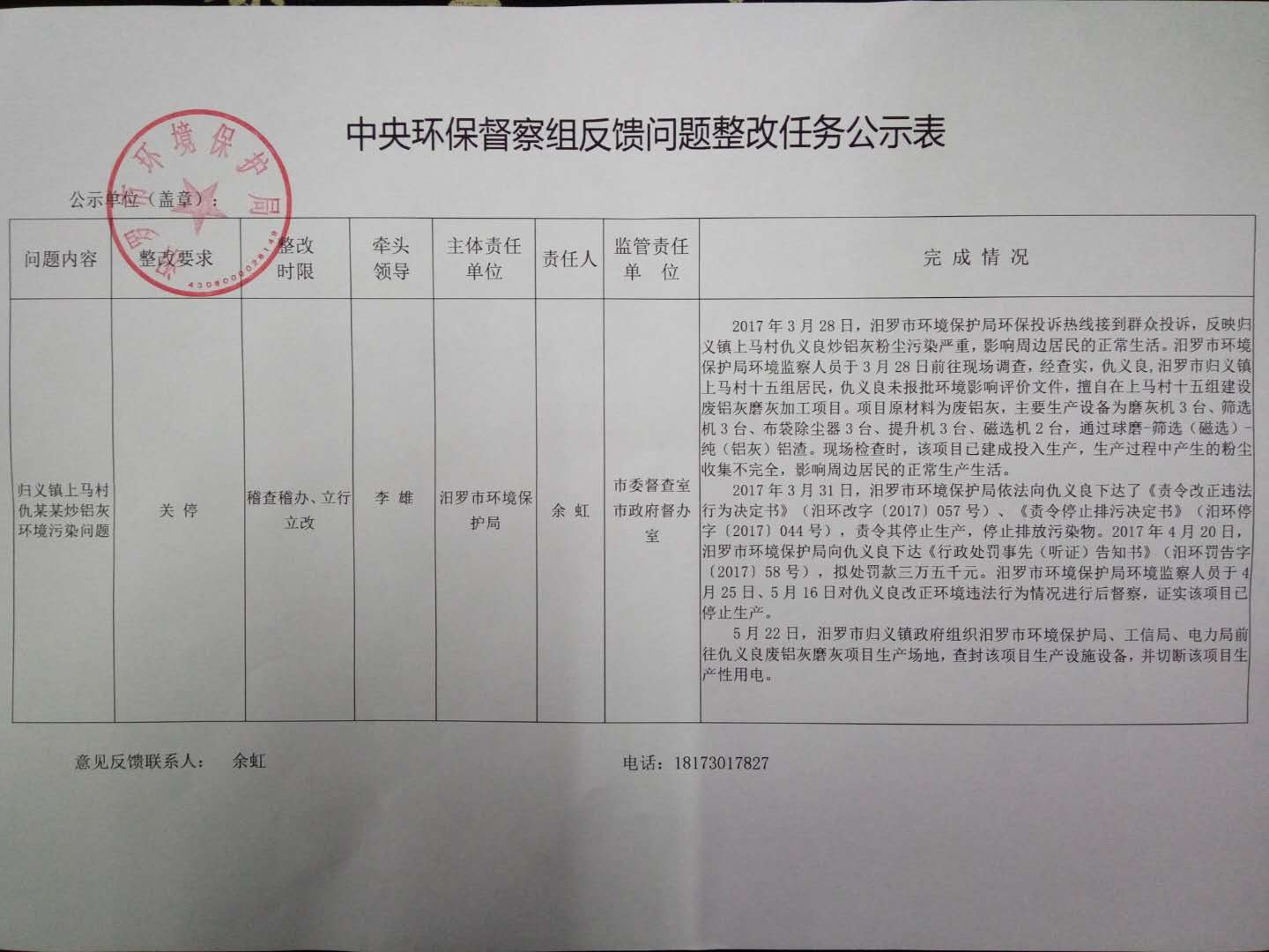 中央环保督察组反馈问题整改任务公示表(归义镇上马村仇某某炒铝灰环境污染问题)
