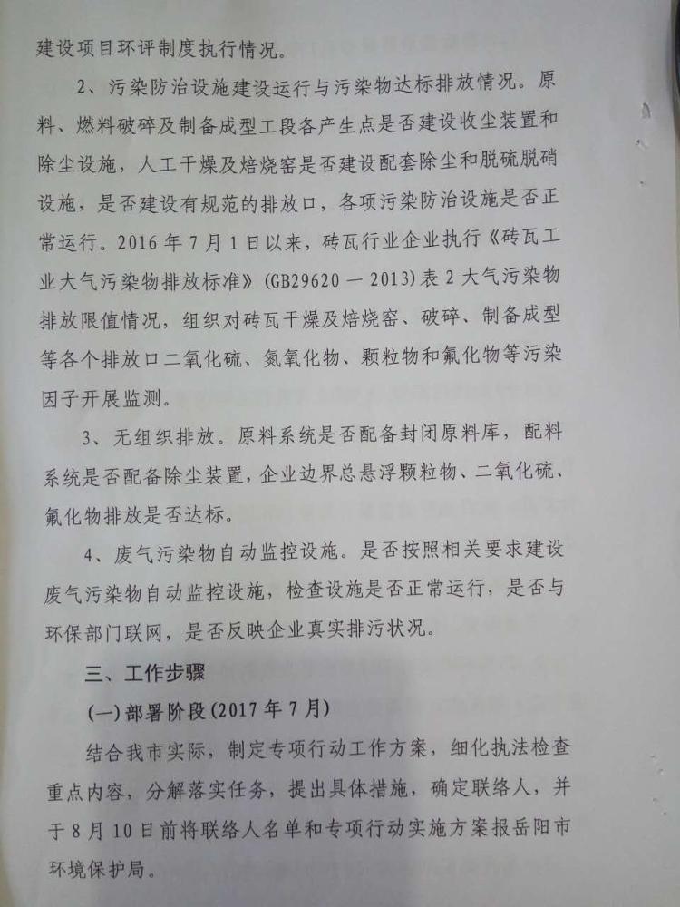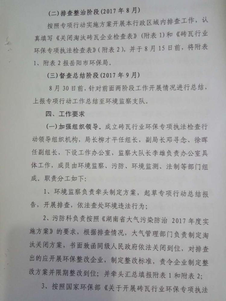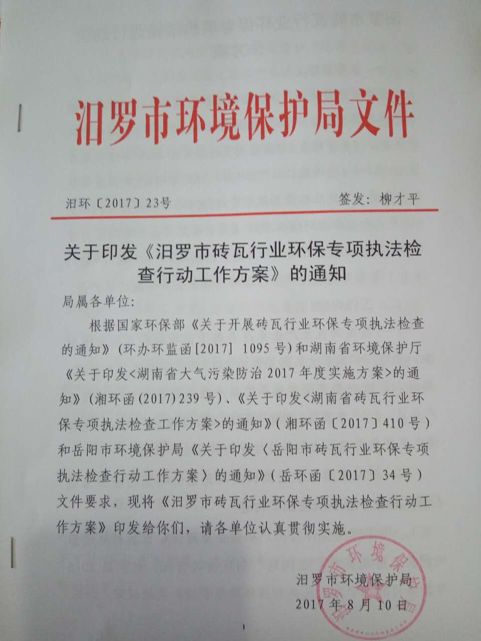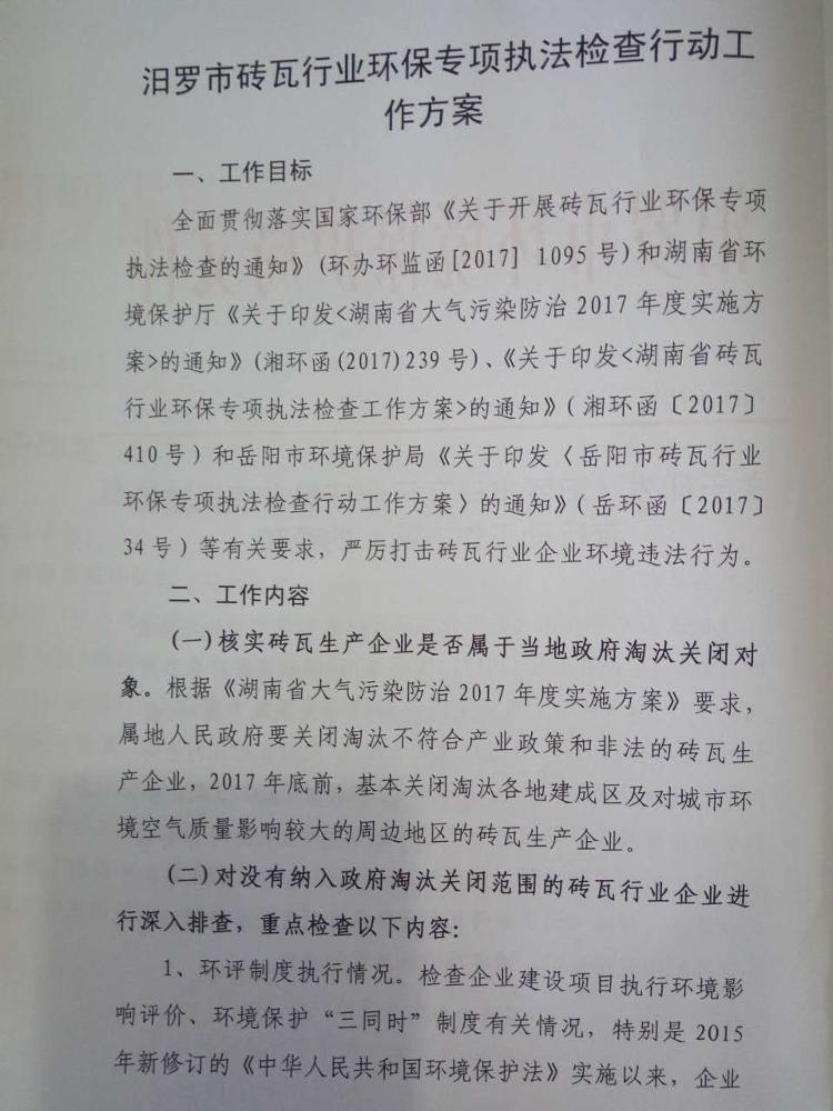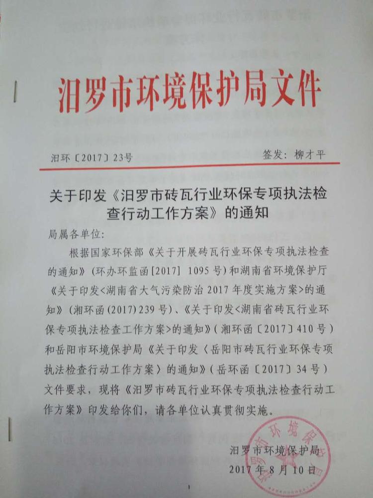 汨罗市环境保护局关于印发《汨罗市砖瓦行业环保专项执法检查行动工作方案》的通知