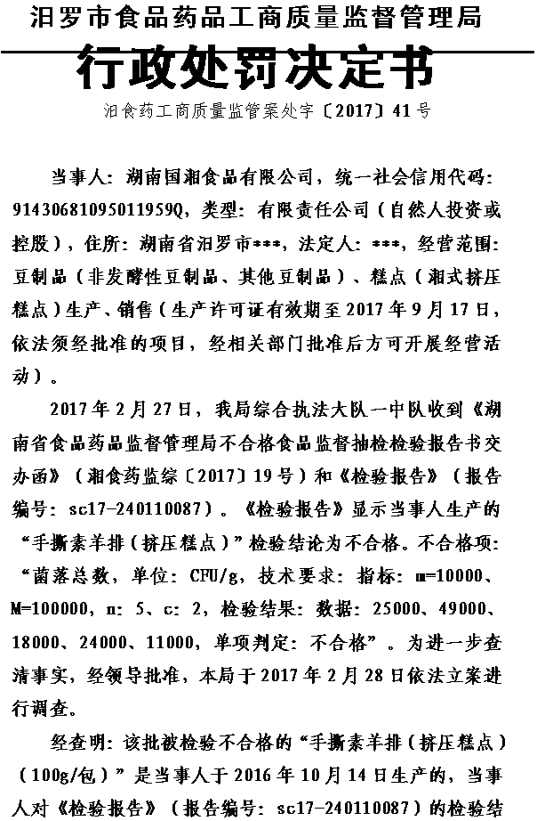 汨食药工商质量监管案处字〔2017〕41号