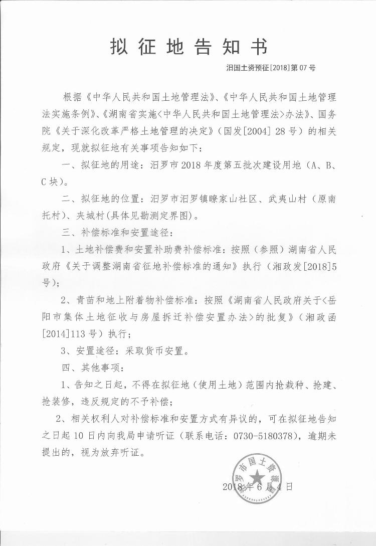 汨罗市2018年第五批次建设用地(ABC地块)拟征地公告