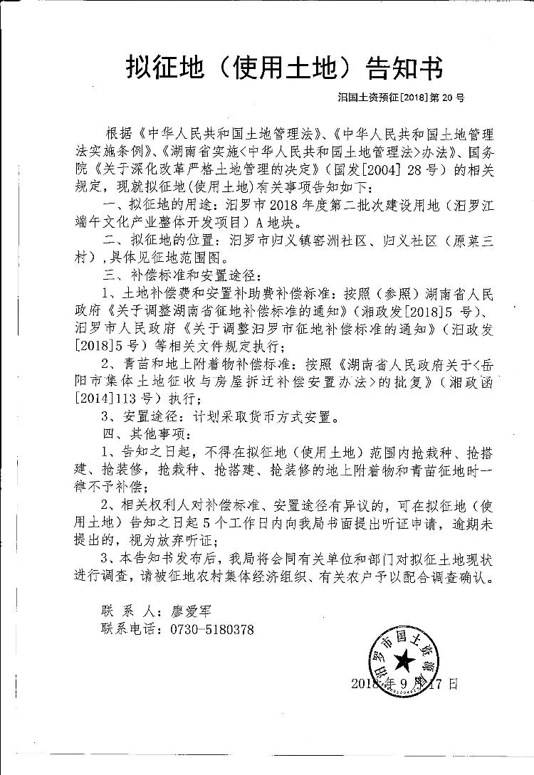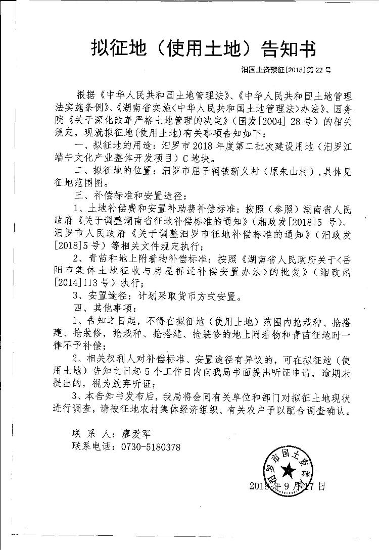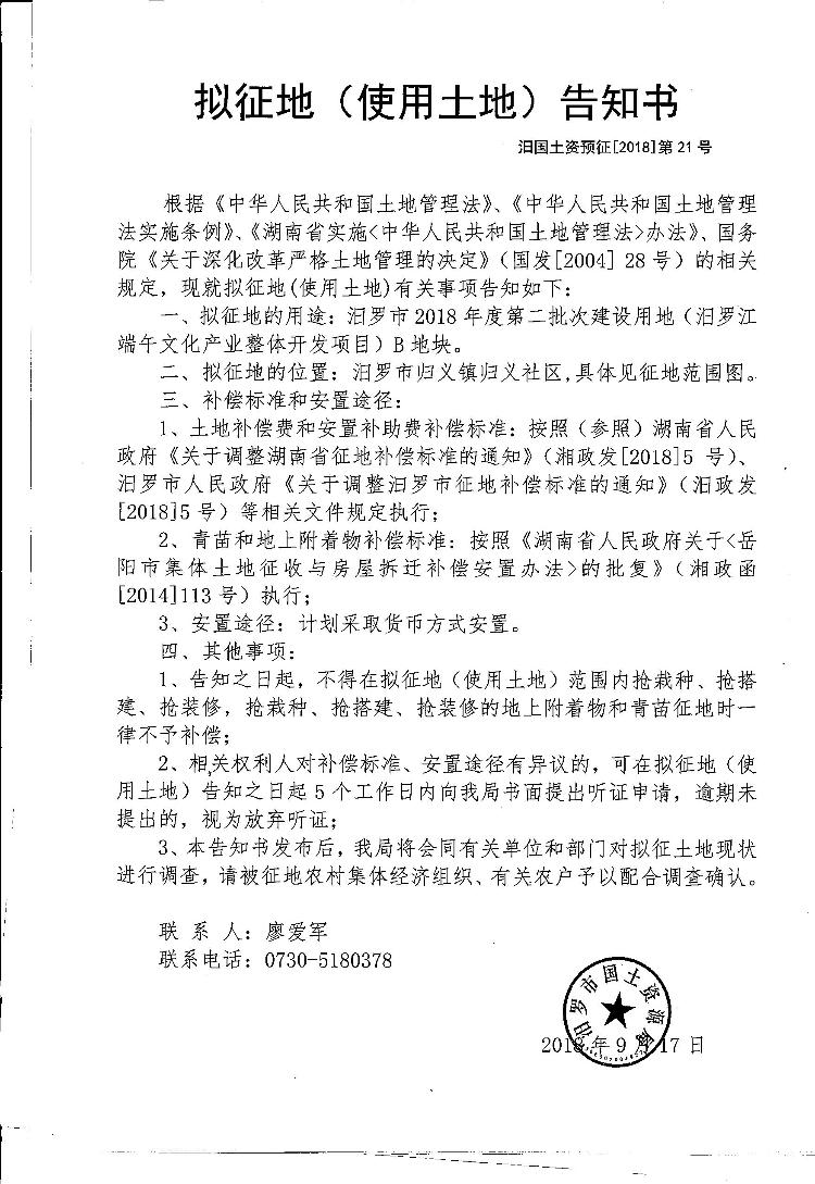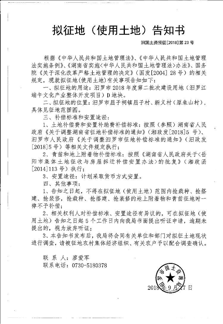 汨罗市2018年度第二批次建设用地(汨罗江端午文化产业整体开发项目)ABCD地块拟征地告知书