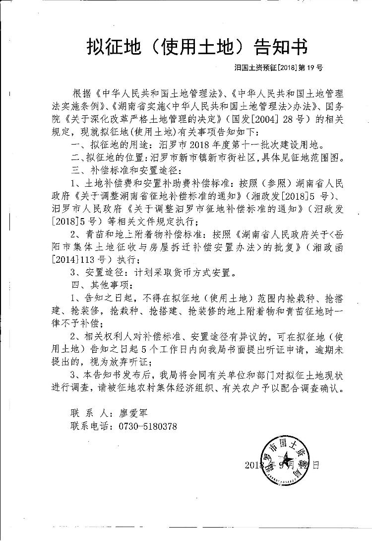 汨罗市2018年度第十一批次建设用地拟征地告知书