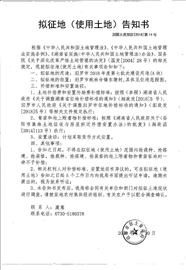 汨罗市2018年度第七批次建设用地(A块)拟征地告知书