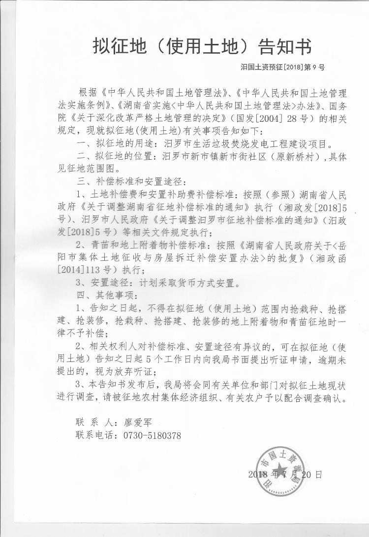 汨罗市生活垃圾焚烧发电工程建设项目预征地公告