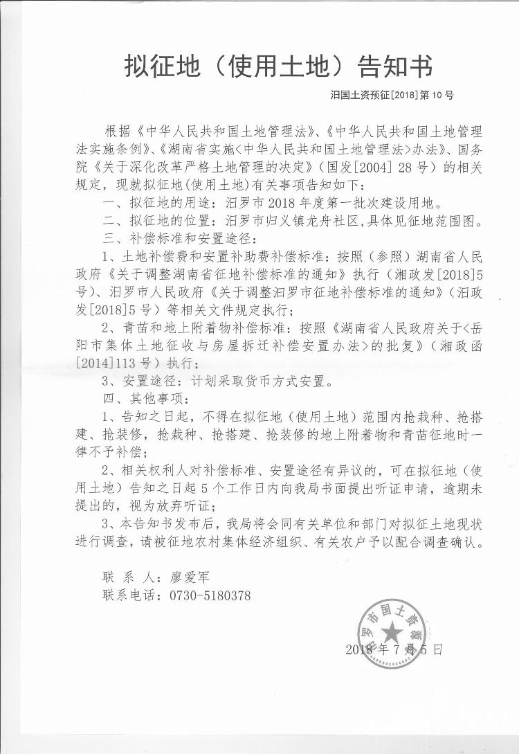 汨罗市2018年度第一批次建设用地预征地公告
