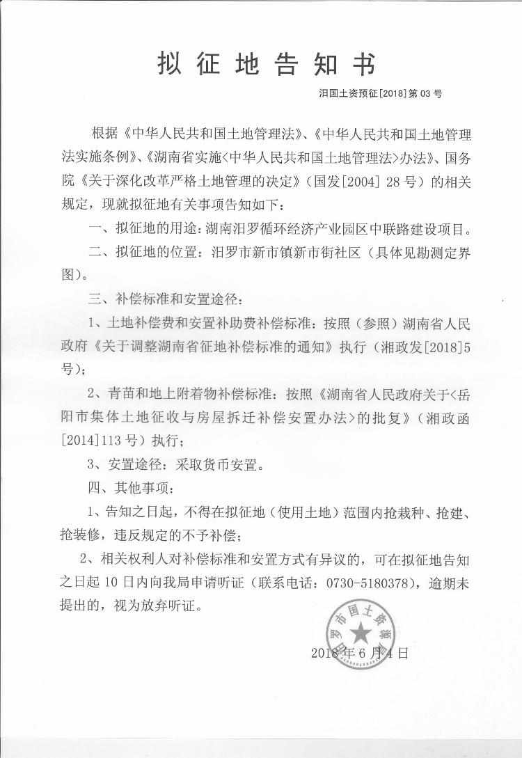 湖南汨罗循环经济产业园区中联路拟征地告知书