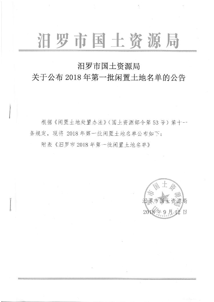 汨罗市国土资源局关于公布2018年第一批次闲置土地名单的公告