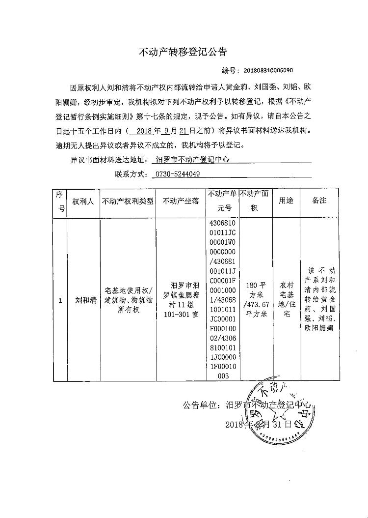 不动产转移登记公告(刘和清转刘国强、欧阳姗姗、黄金莉、刘韬)