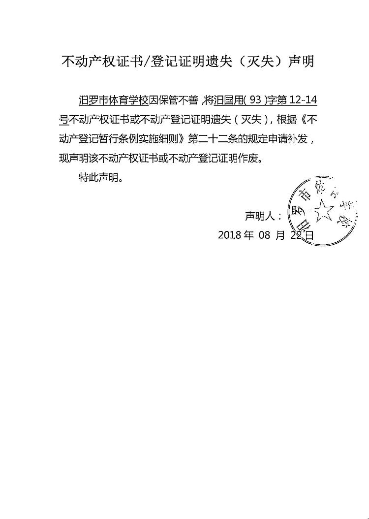 不动产权证书遗失声明(汨罗市体育学校)