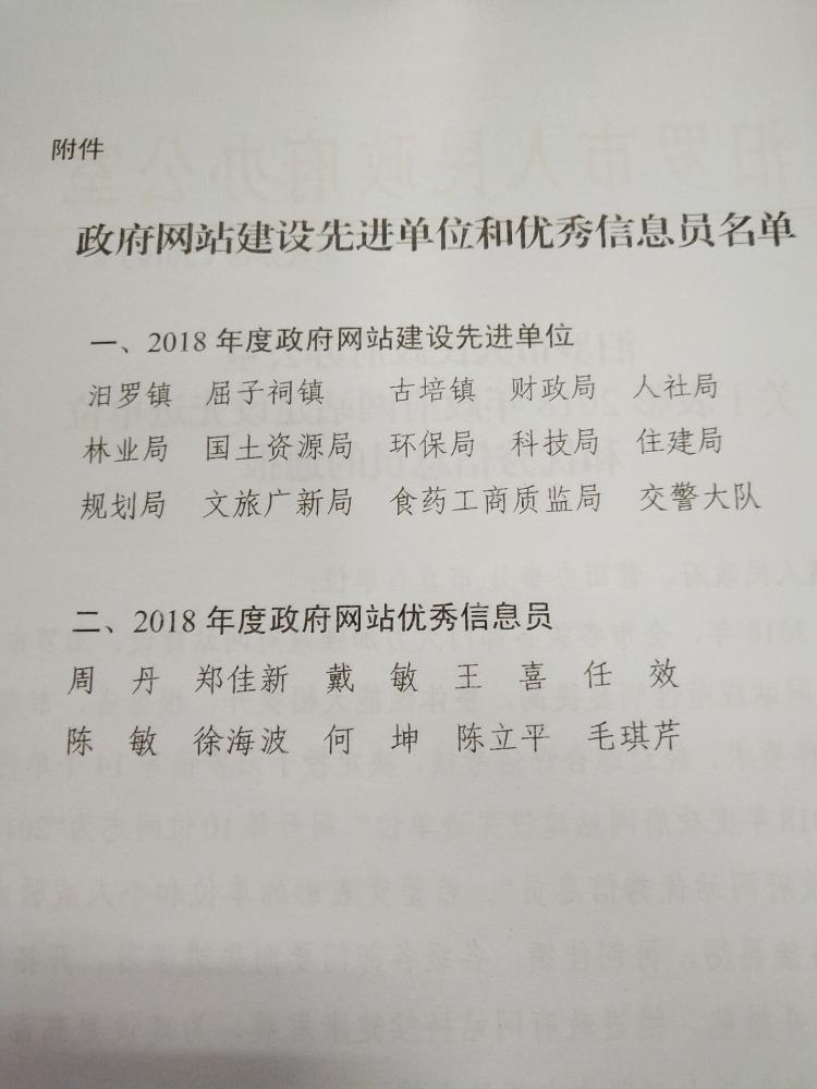 汨罗市人民政府办公室关于表彰2018年政府网站建设先进单位和优秀信息员的通报