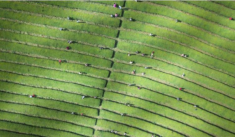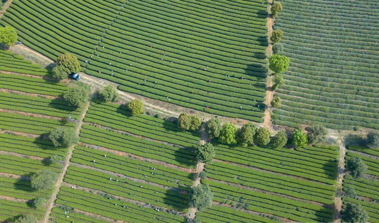 踏进汨罗屈子祠镇新茶村,眼前是一望无际的绿:整整齐齐的茶树并在一起,一行行,一簇簇,像一条条绿色的波纹荡漾在村舍房屋间。