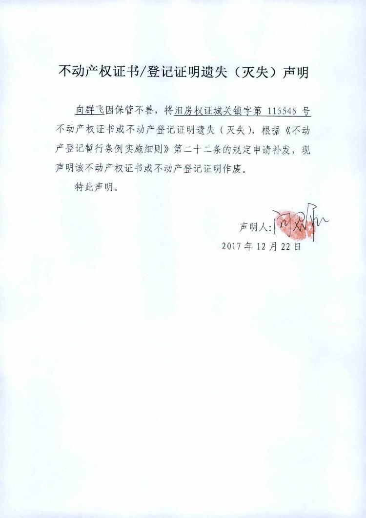 不动产权证书遗失声明(向群飞)