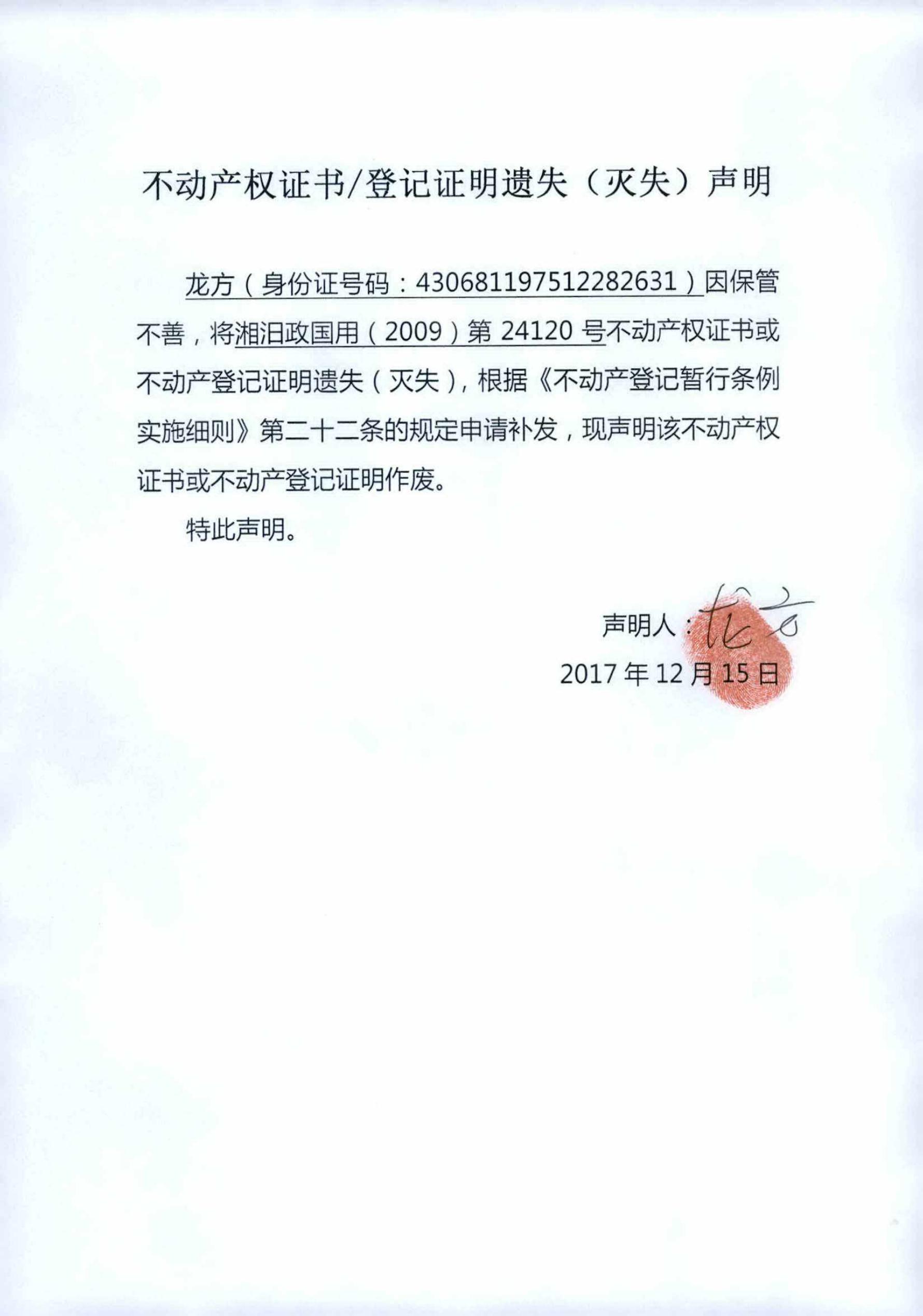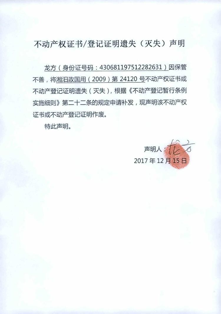 不动产权证书遗失声明(龙方)