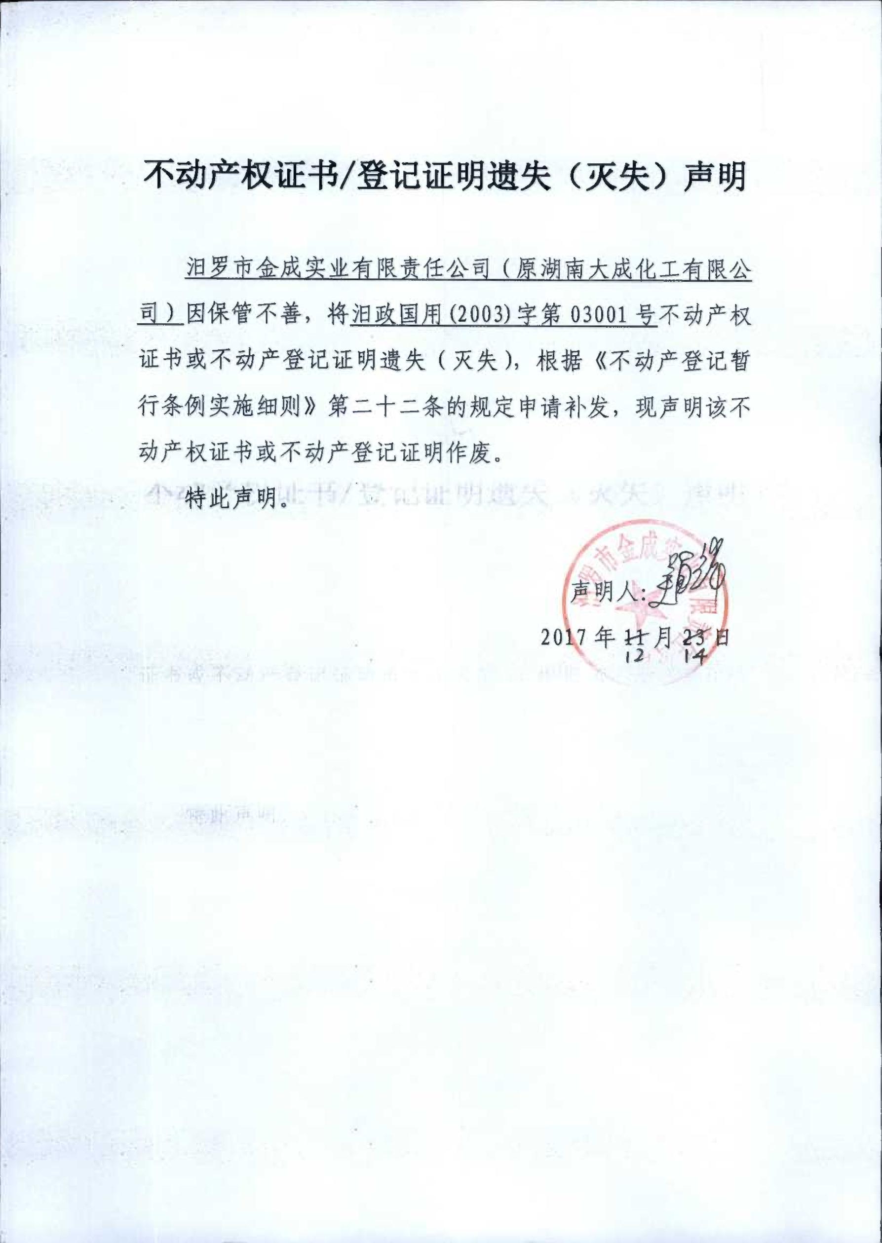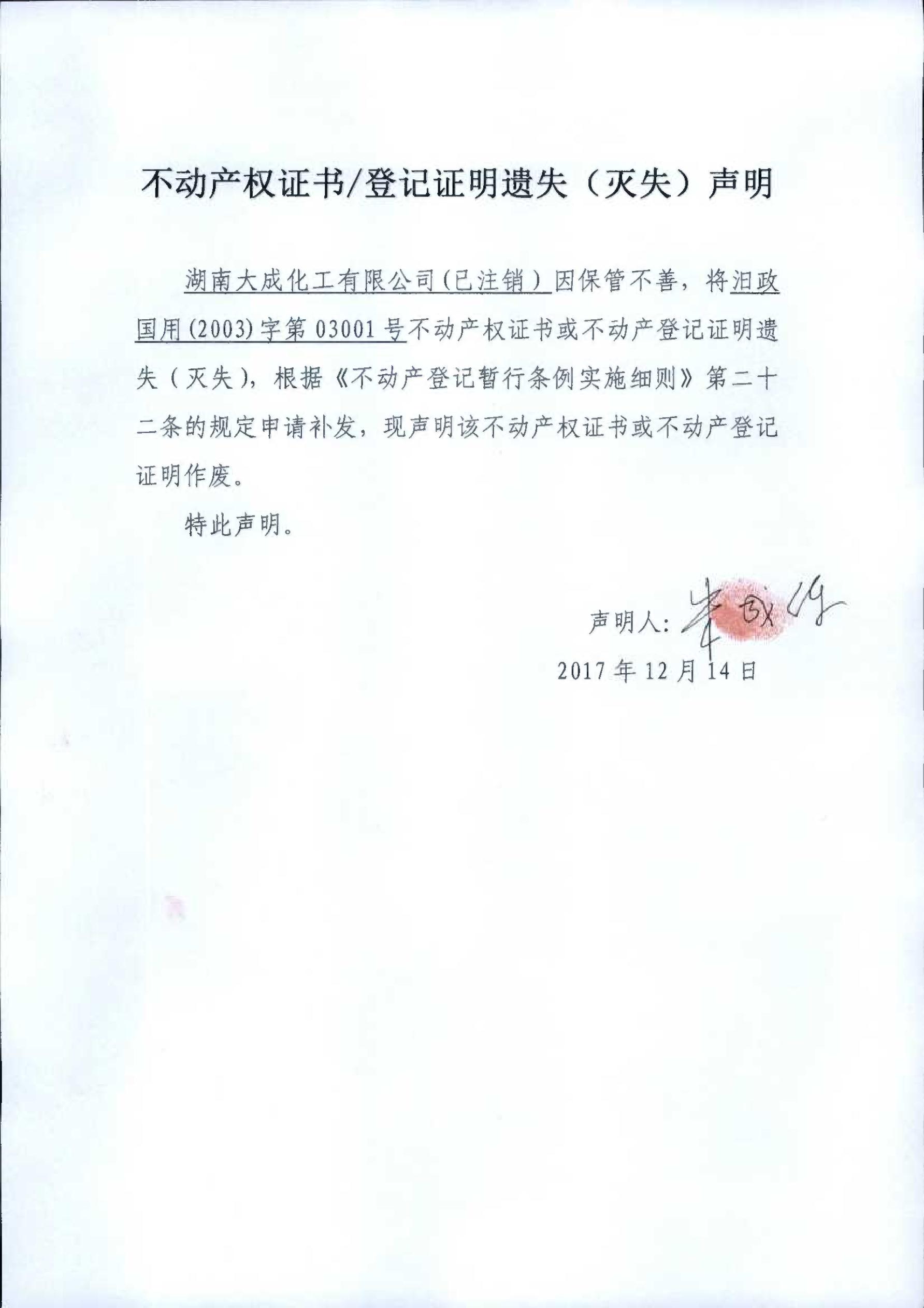 不动产权证书遗失声明(湖南大成化工有限公司)