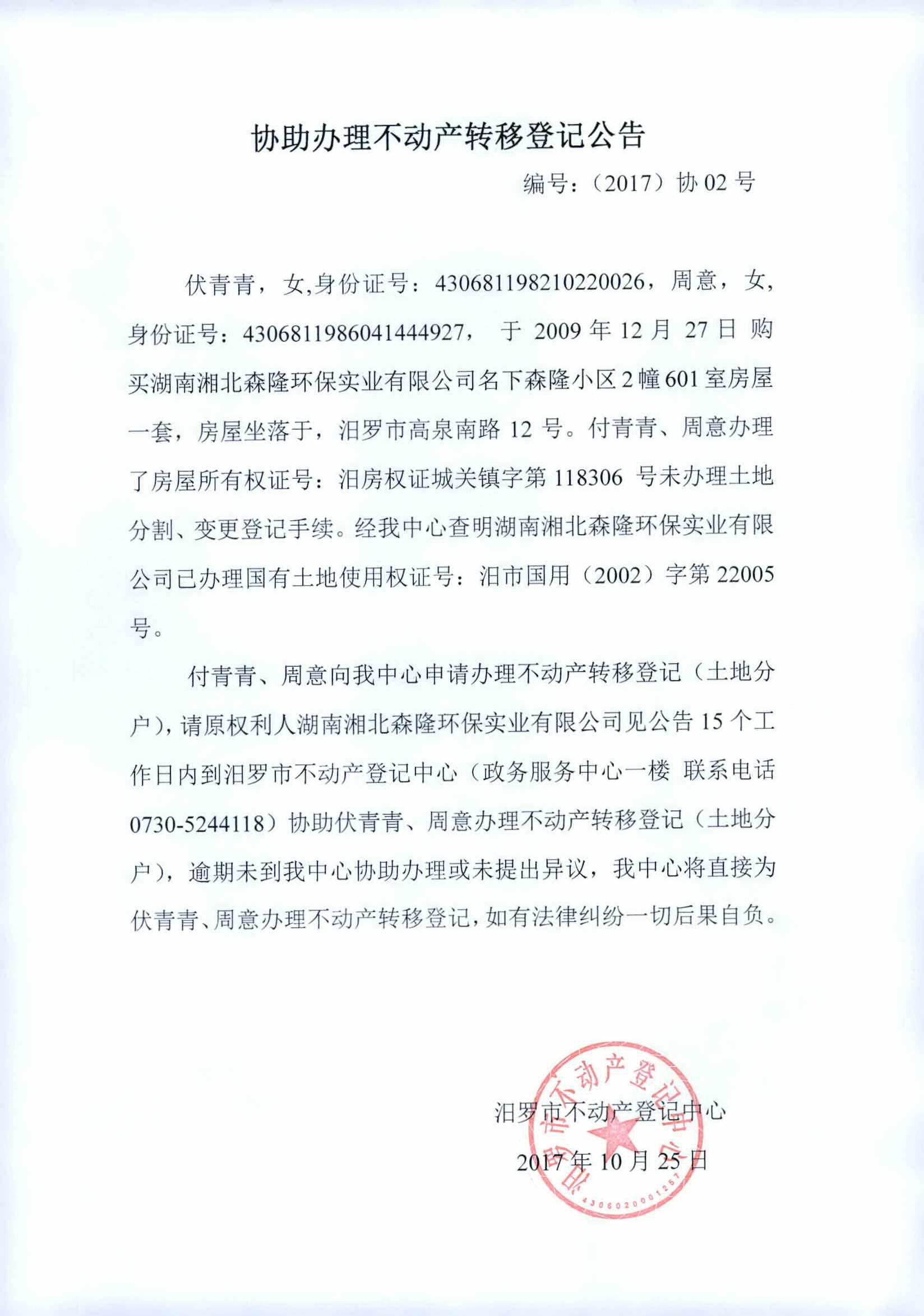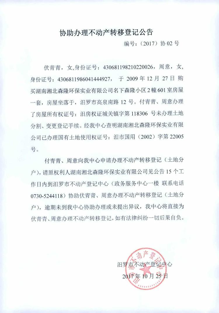 协助办理不动产转移登记公告(伏青青)