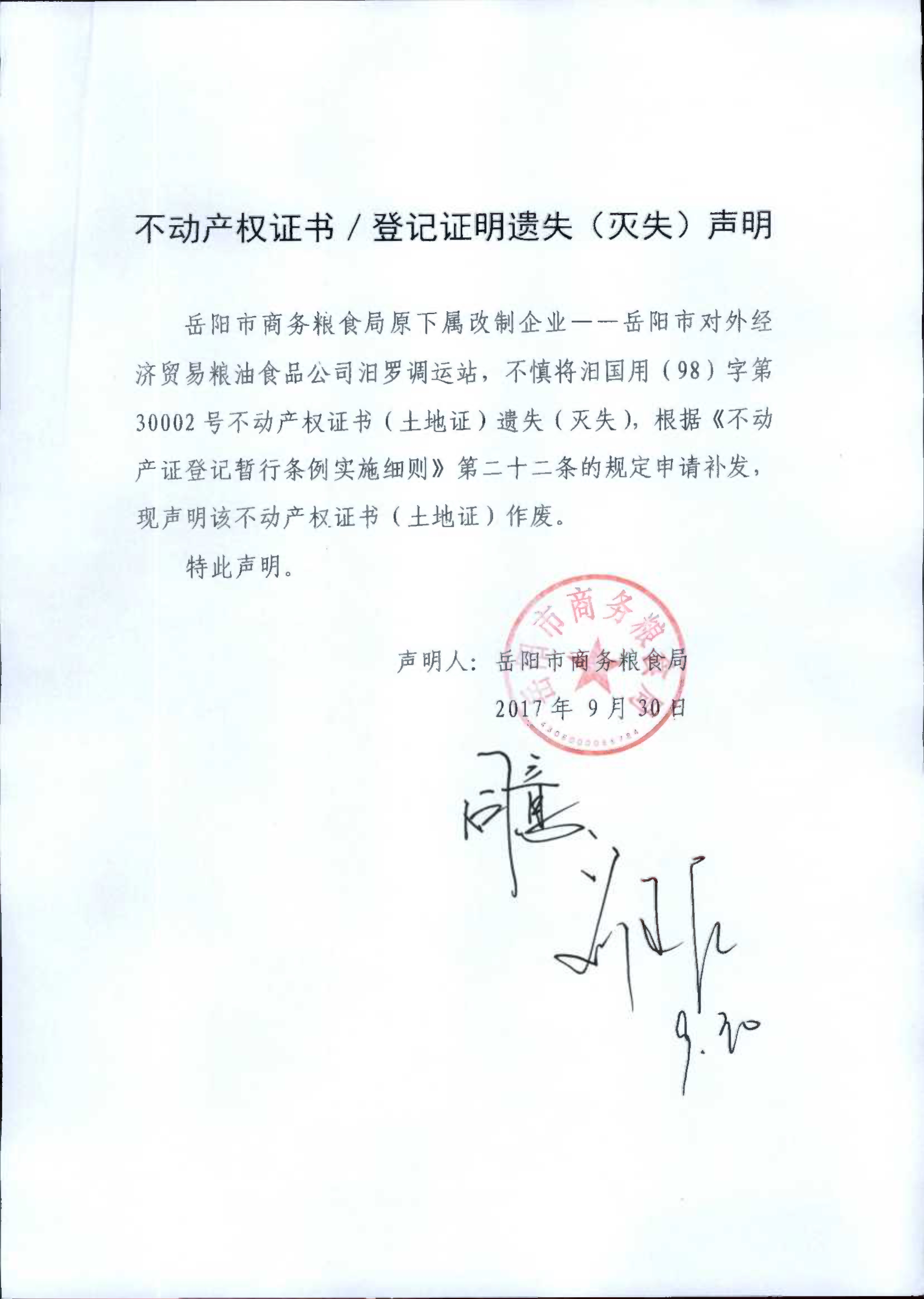 不动产权证书遗失声明(岳阳市商务粮食局)