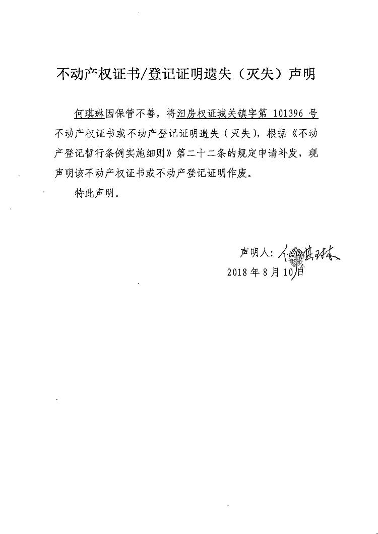 不动产权证书遗失声明(何琪琳)