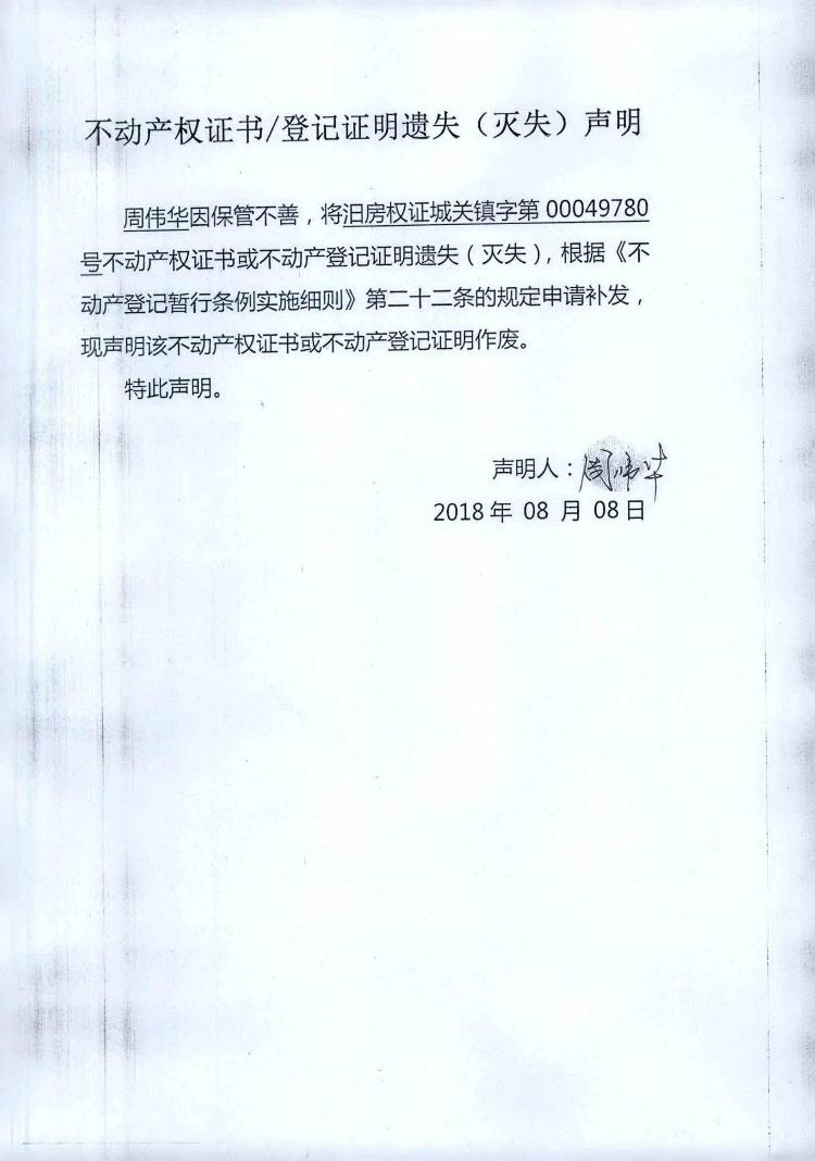 不动产权证书遗失声明(周伟华)