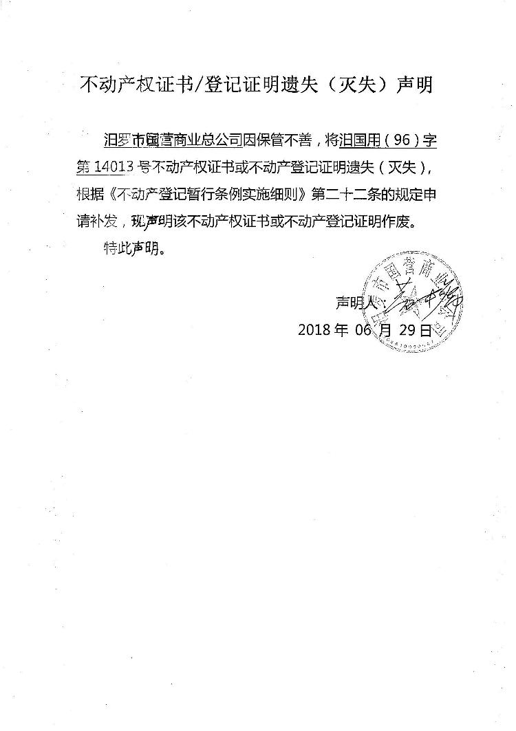 不动产权证书遗失声明(汨罗市国营商业总公司)