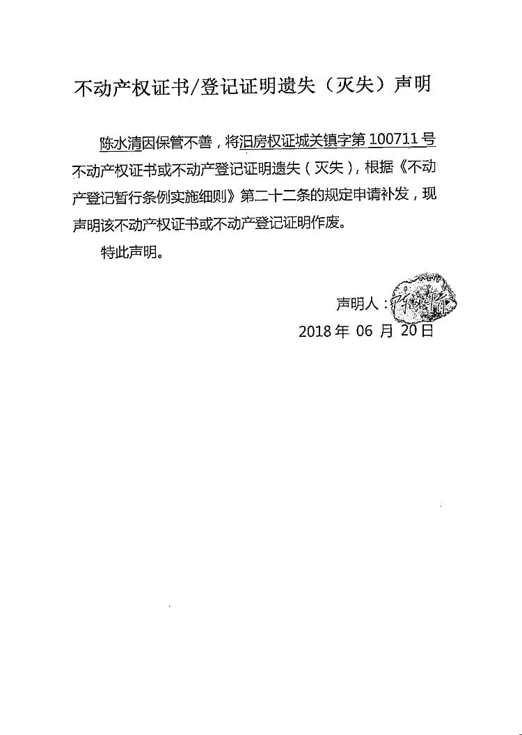 不动产权证书遗失声明(陈水清)