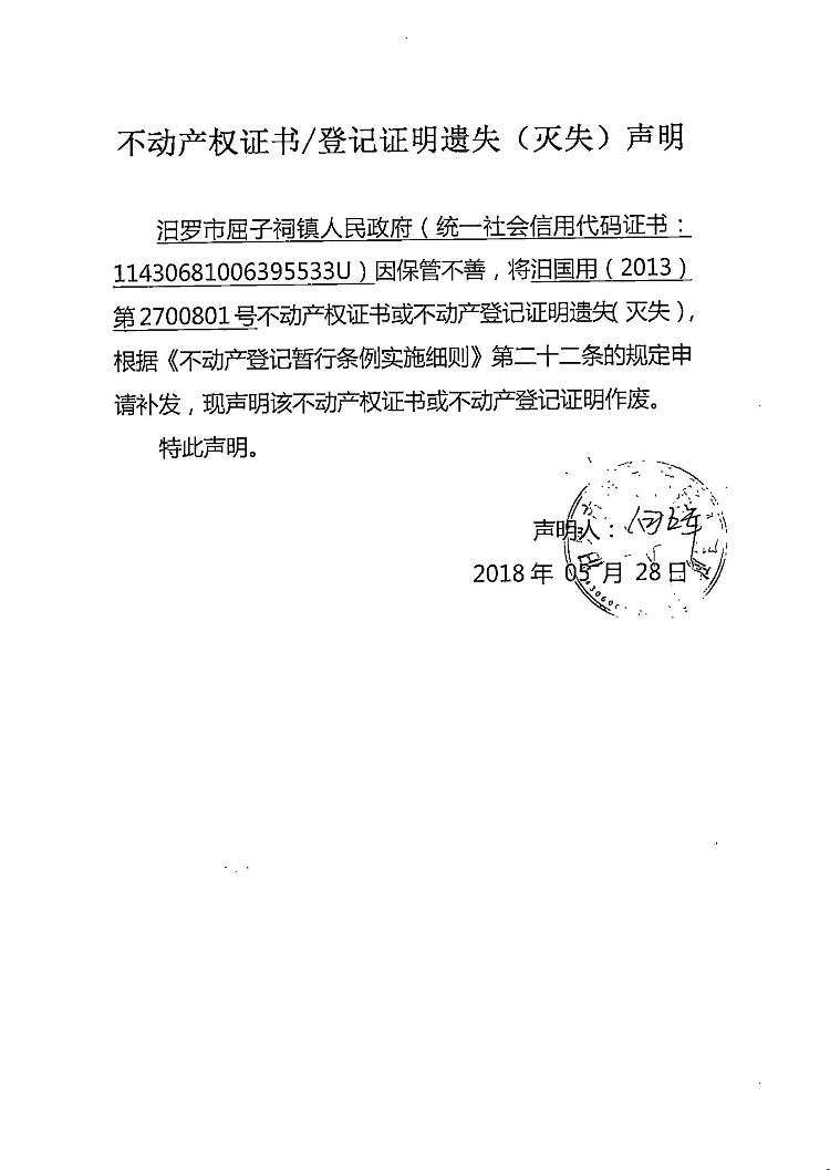 不动产权证书遗失声明(汨罗市屈子祠镇人民政府)