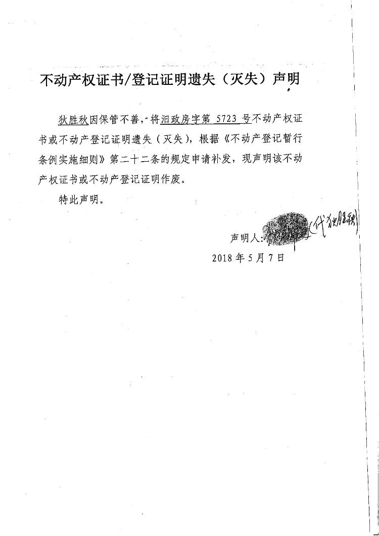 不动产权证书遗失声明(狄胜秋)