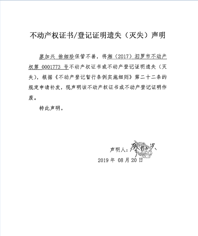 不动产权证书遗失声明(廖加兴)