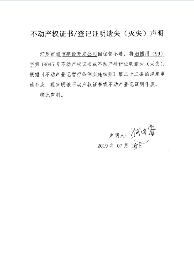不动产权证书遗失声明(城市建设开发公司)
