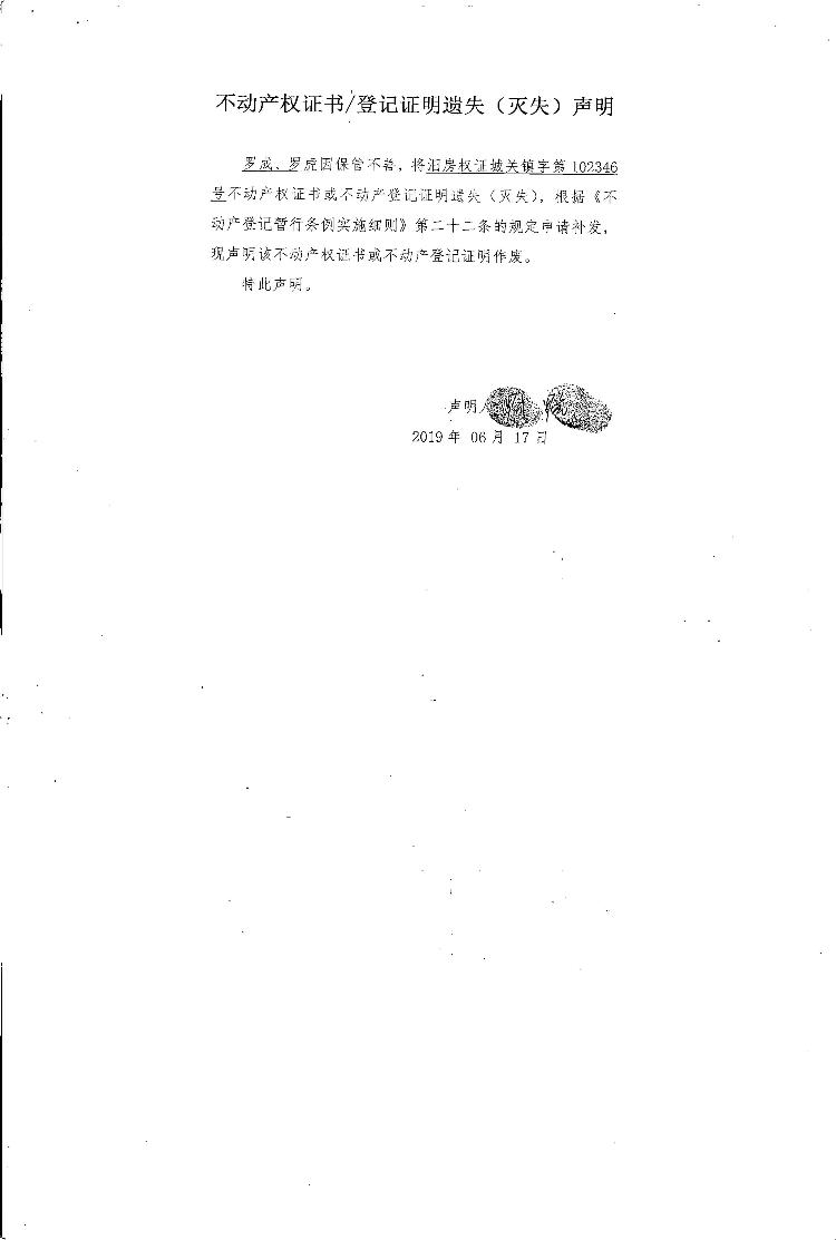 不动产权证书遗失声明(罗成、罗虎)