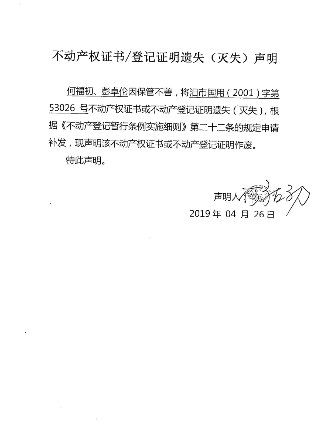 不动产权证书遗失声明(何褔初)