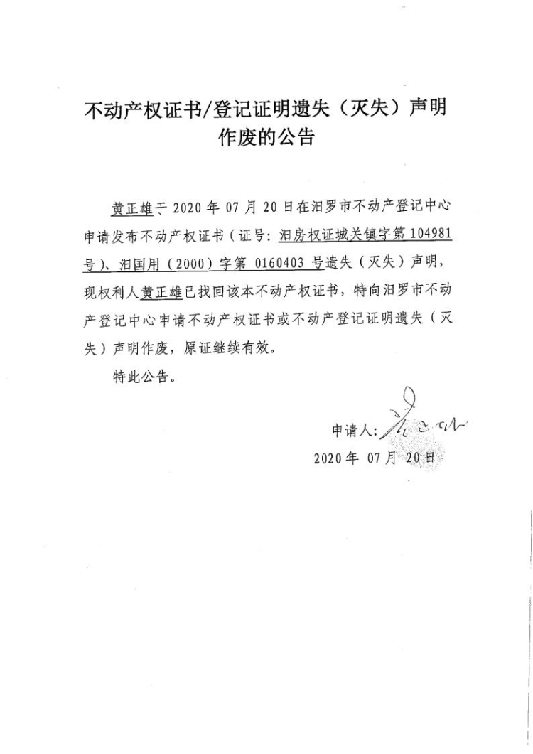 不动产权证书/登记证明遗失(灭失)声明作废的公告(黄正雄)