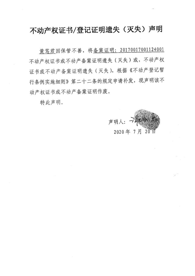 不动产权证书遗失(灭失)声明(黄笃君)