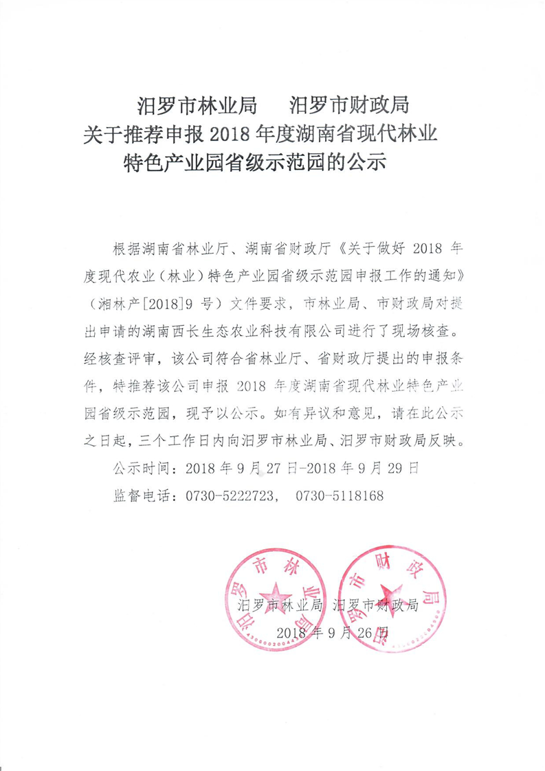 关于推荐申报2018年度湖南省现代林业特色产业园省级示范园的公示