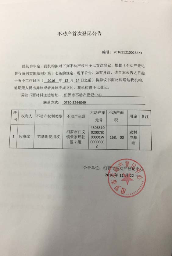 不动产首次登记公告(何海冰)