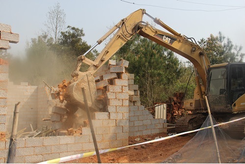 当天上午9时许,拆除行动正式开始。一辆大型挖掘机驶入现场,挥舞“铁臂”向一处房屋外墙砸去,伴随着巨大的轰鸣,该违章建筑轰然倒地。当天,执法组依法拆除了“飞地”园区启动区3平方公里范围内的汉山村青龙组、贺公组、塾塘组等6个组的10余处违章建筑。