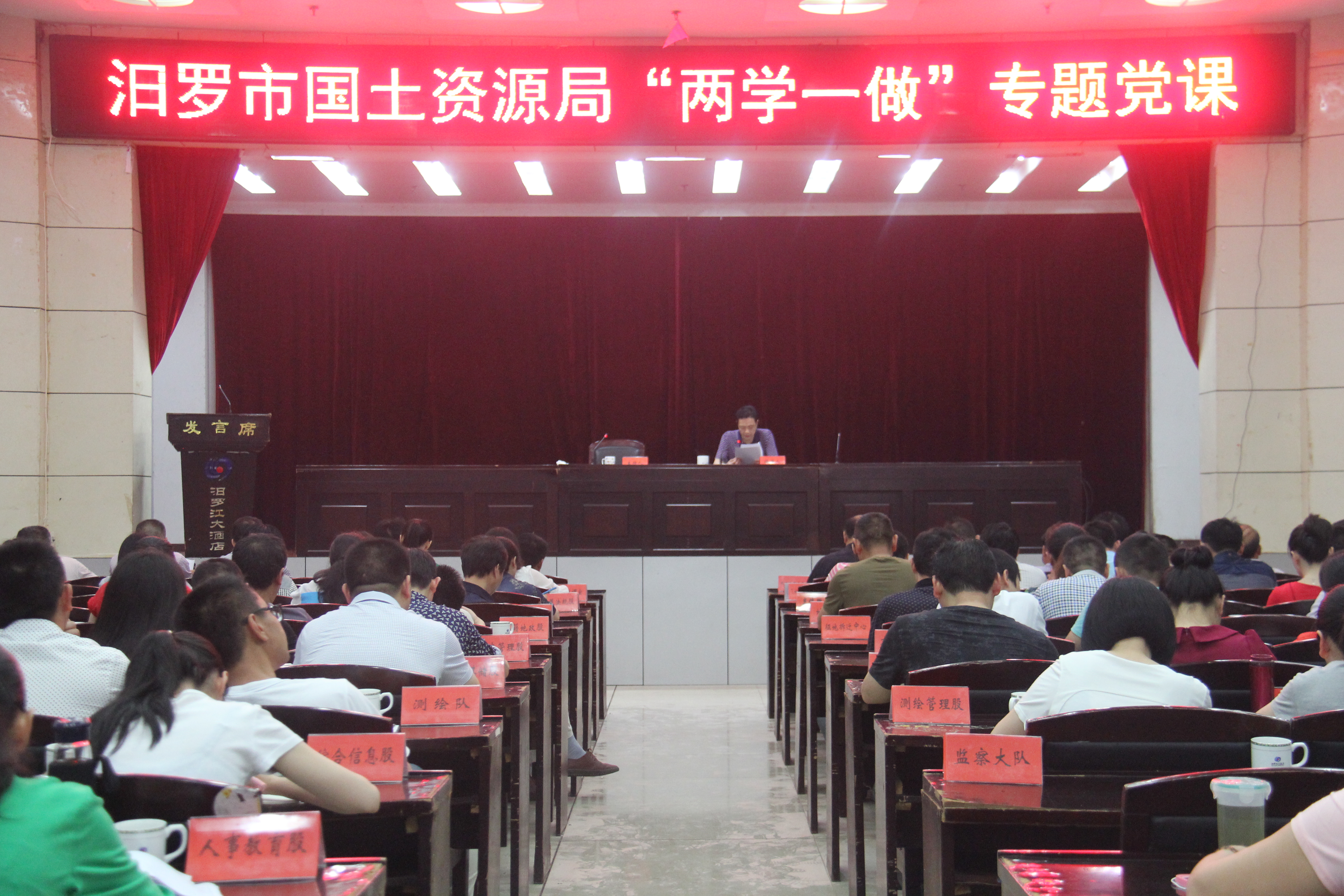 6月1日,汨罗市国土资源局召开“两学一做”专题党课培训,党组书记、局长李石芳以“加强干部队伍能力建设,增强谋事干事本领”为主题,为局机关全体党员干部、乡镇所长及离退休党员干部174人讲专题党课。