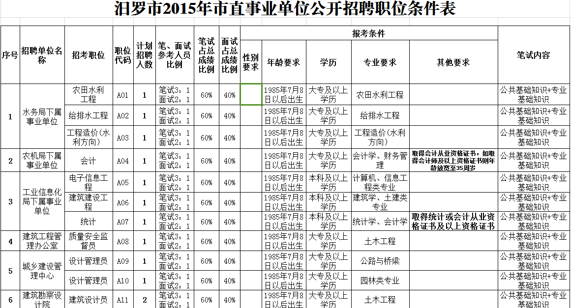 汨罗市2015年市直事业单位公开招聘职位条件表.zip