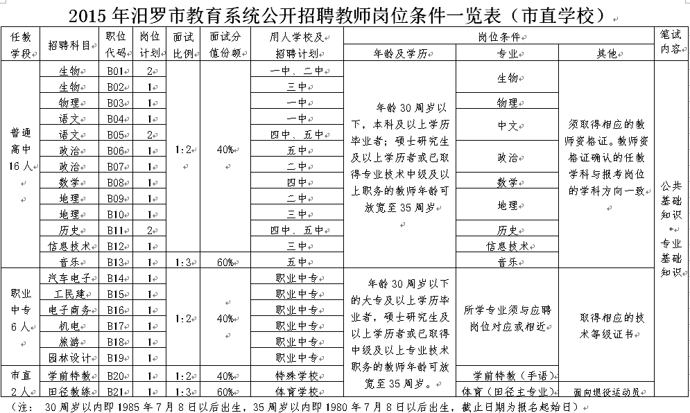 (五)岗位、年龄、学历、专业和其他要求见附表。详情请查询岳阳市人力资源和社会保障公共服务网、中国汨罗网、汨罗市政府门户网、汨罗市人力资源社会保障公共服务网。
