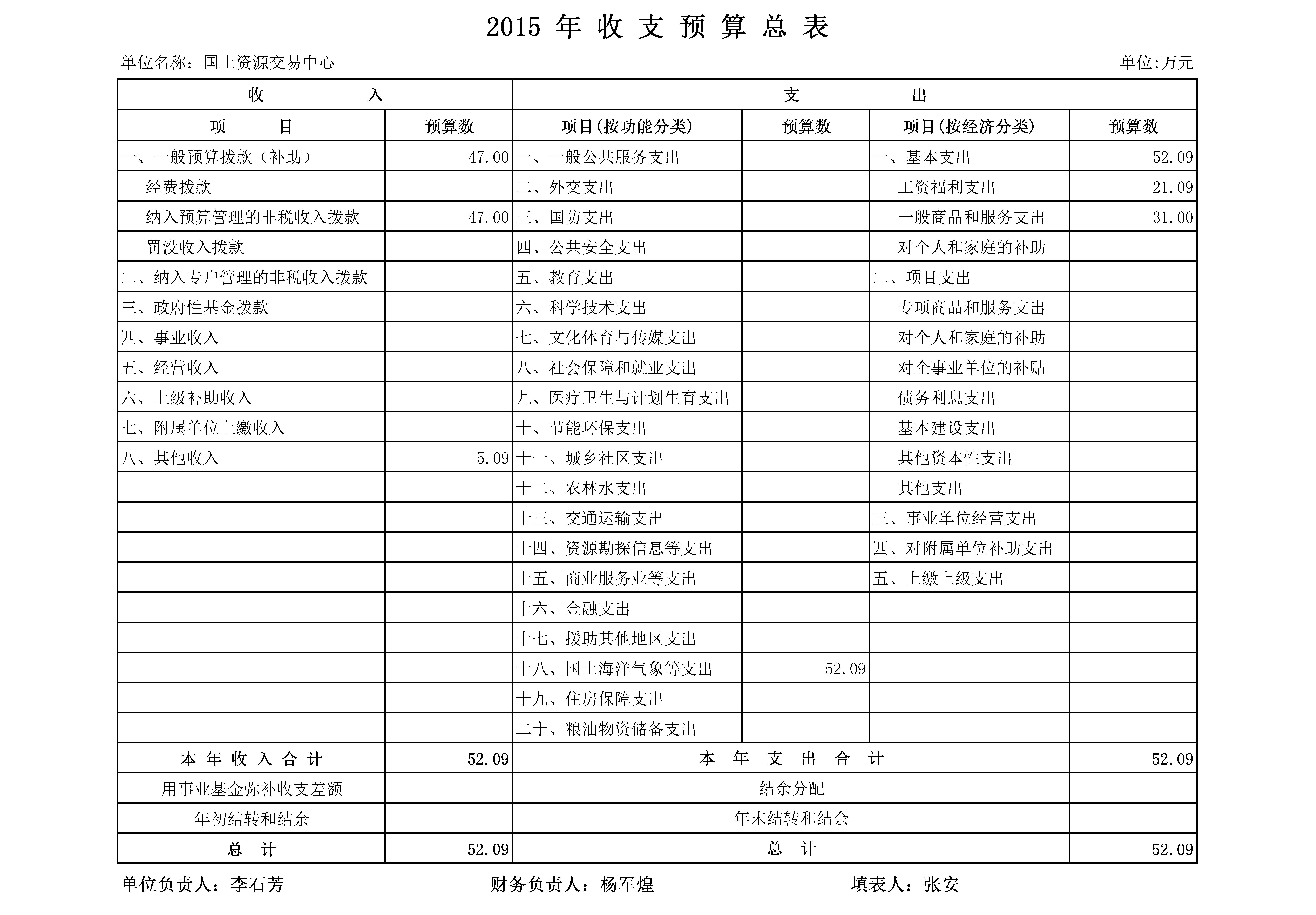 2015年汨罗市国土资源交易中心收支预算总表