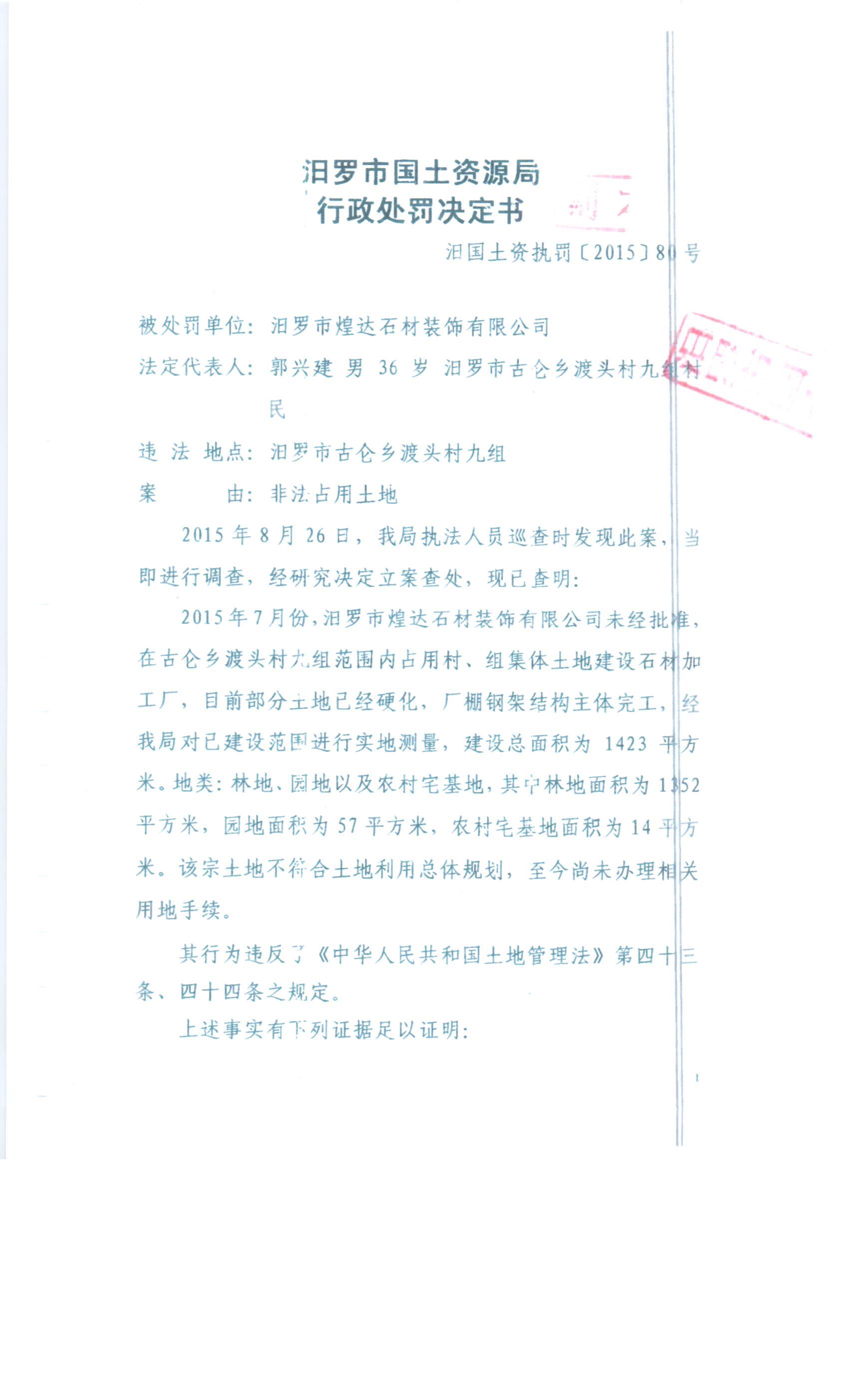 汨罗市煌达石材装饰有限公司非法占用土地案