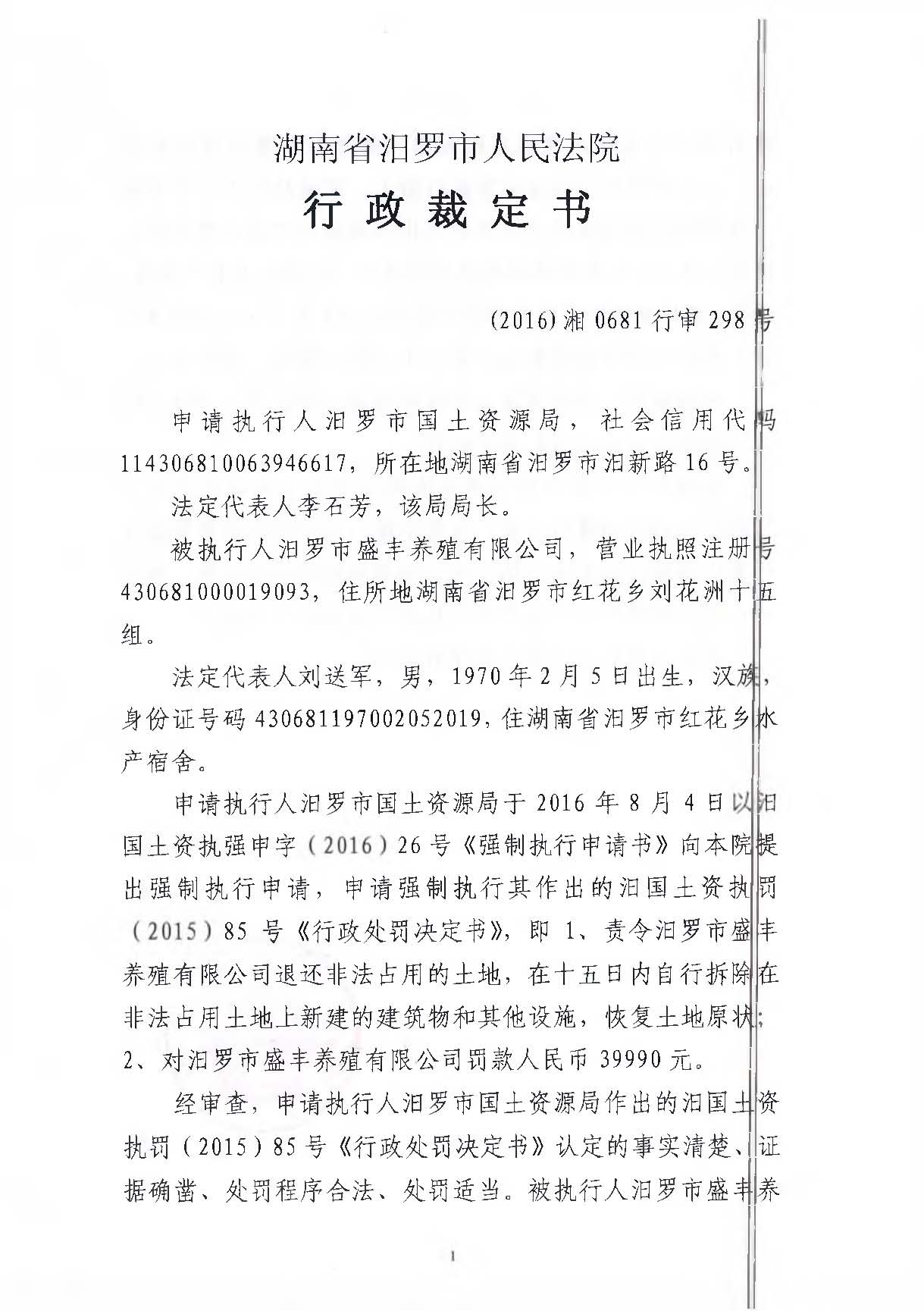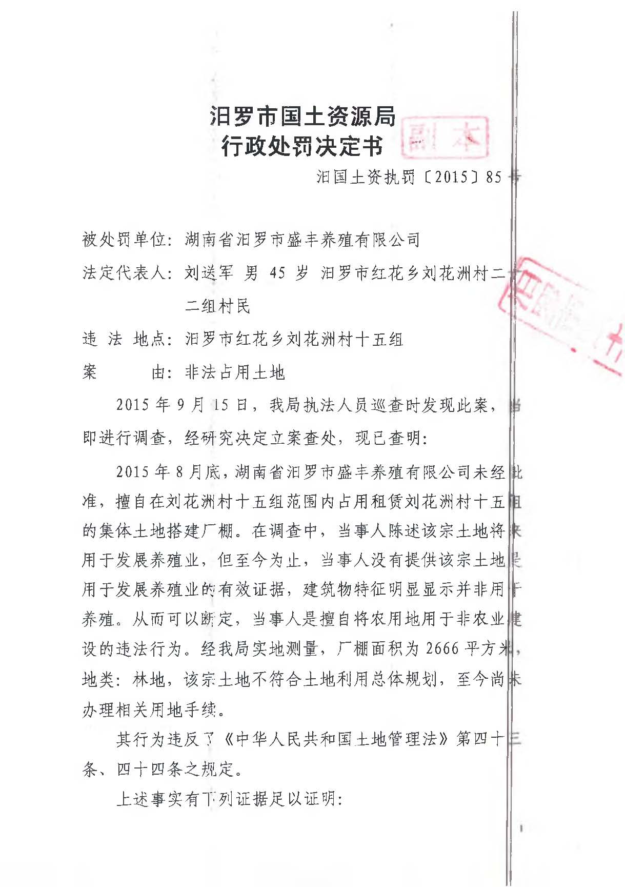 湖南省汨罗市盛丰养殖有限公司非法占用土地案