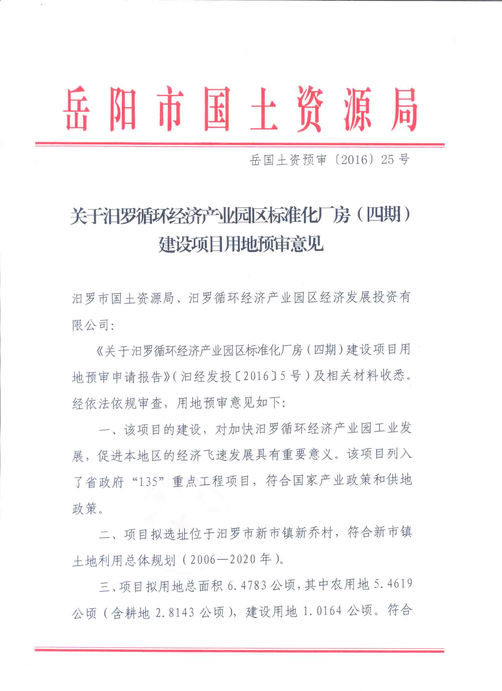 汨罗循环经济产业园区标准化厂房(四期)用地预审意见