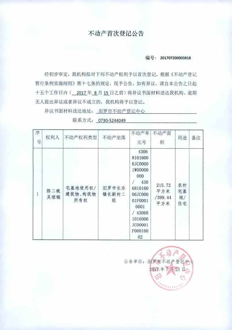 不动产首次登记公告(陈二桃)